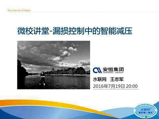 2016年7月20日晚8时,安恒集团水联网技术服务中心总工程师王志军先生受供水微校校长窦军先生之邀,发起课题为《漏损控制中的智能减压》的微信课程,本次课程时长为1小时,听课人员共计6389人。